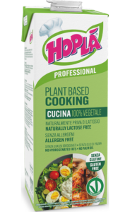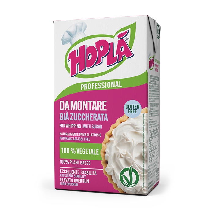 Hoplà Professional 100% vegetale, da montare già zuccherata, ideale per impieghi in pasticceria e gelateria; in particolare, per la preparazione di mosse, semifreddi e gelati e per la decorazione e coperture di torte.